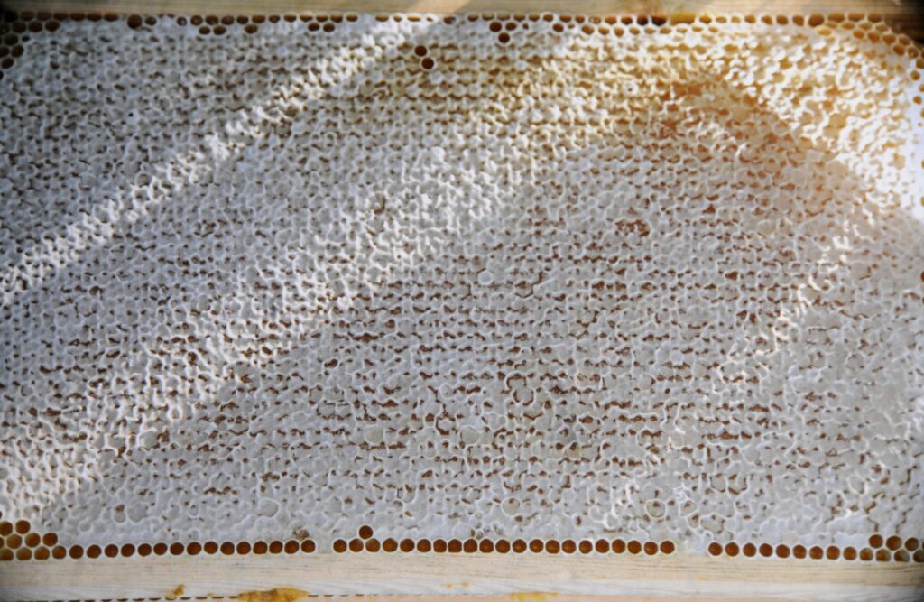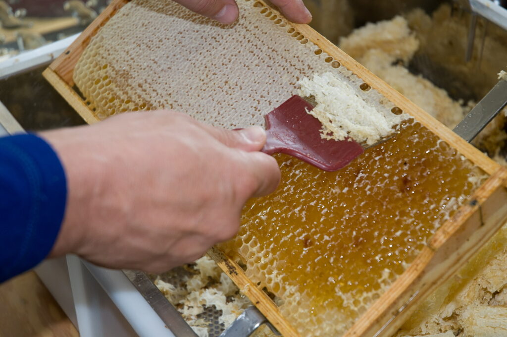 Wir entfernen dann die Wachsdeckel (entdeckeln die Wabe)
